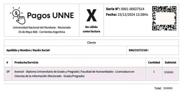 Comprobante de sistema de Pagos UNNE del Arancel por emisión