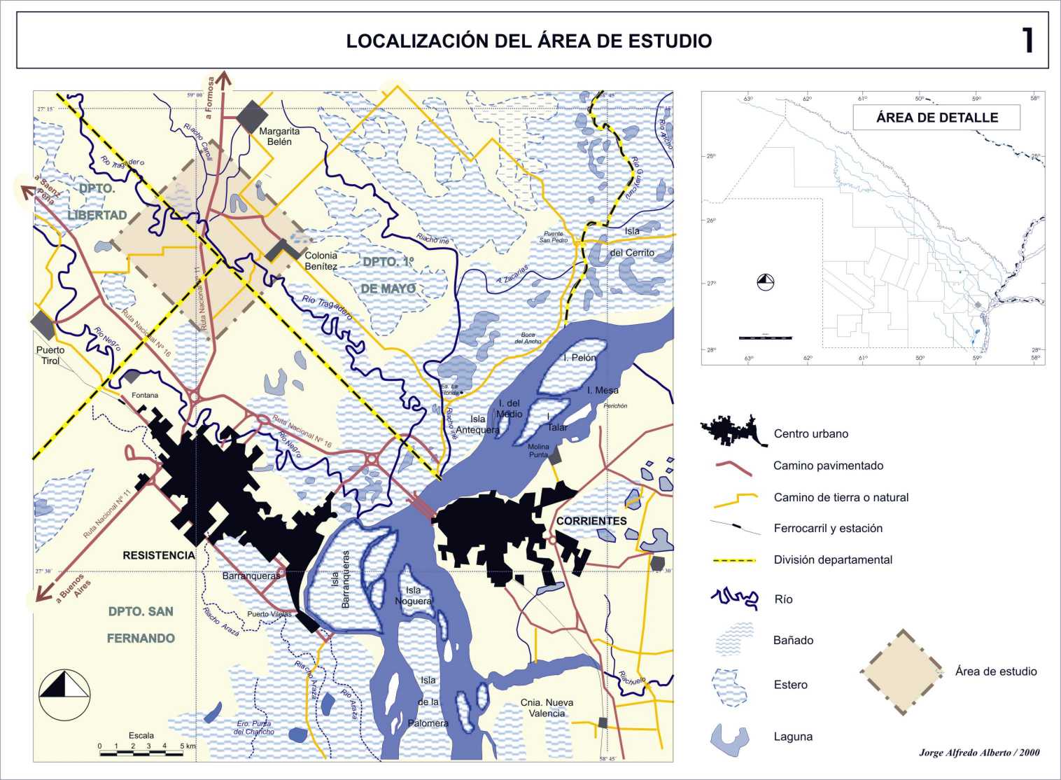 Área de estudio A los efectos de la realización del presente trabajo se ha escogido como área de estudio (fig. 1) una superficie aproximada de 100 km2 (10 km de ancho, con sentido NE a SO, por 10 km de largo, con sentido NO a SE) localizada en el sector oriental de la Provincia del Chaco cruzada por el paralelo de 27º 19´ latitud Sur y el meridiano de 58º 59´ longitud Oeste. La misma responde a un área del ámbito periurbano del Gran Resistencia localizado a unos 10 km. al norte del mismo, atravesado por el río Tragadero y la ruta Nacional nº 11, en el cual se encuentran poblados como Colonia Benitez y Tres Horquetas, y parajes como Campo Rossi y El Tropezón. Comprende parte de los Departamentos Libertad (Circunscripción II Sección A), San Fernando (Circunscripción II Sección A) y 1º de Mayo (Circunscripción VIII, IX, X) según el catastro de la Provincia del Chaco. |
