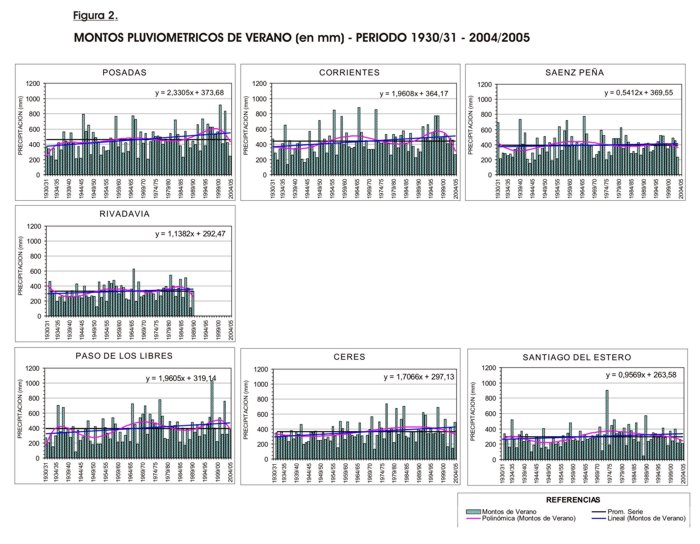 4. Los Montos o Registros Estacionales de Precipitación En un trabajo publicado en la revista IDIA en diciembre de 1951, Teodoro Weber, manifestaba que “Es muy frecuente escuchar opiniones en el sentido de que el clima está sufriendo un cambio en nuestros días. La lluvia es el elemento citado con más frecuencia como cambiante, atribuyéndosele una sensible disminución. Este convencimiento tan arraigado en la campaña, es compartido por muchos profesionales y también lo fue por el autor de estas líneas en sus comienzos...” Más adelante continúa preguntándose “¿cuál es la explicación de tales fenómenos? Sencillamente se opina que las lluvias disminuyen y que el clima está cambiando. Hay que desechar tan sencilla y fácil explicación y estudiar los fenómenos de la naturaleza en todos y en cada uno de sus variados aspectos. Ellos no tienen siempre una causa única, sino varias causas concurrentes. Necesario es conocer todos los factores, discernir acertadamente la importancia de cada uno y descubrir de tal modo las causas principales. Conocidas éstas, puede encararse la solución sobre una firme base”. 6 Estas palabras no han perdido actualidad, ya que algo más de medio siglo después, vuelven no sólo a escucharse sino también a responderse de idéntica manera. La respuesta a los interrogantes planteados debe, por lo tanto, fundamentarse en el análisis de las series de precipitación de las estaciones del Nordeste de nuestro país, a lo largo de los 75 años de registro, a los que actualmente se pueden acceder a través de los sitios web citados anteriormente. Con estos procedimientos se podría estar en condiciones de detectar si las diferencias existentes se deben realmente a un cambio climático o si sólo responden a fluctuaciones de corto y mediano plazo. 4.a. Fluctuaciones de Verano Los montos de precipitación de Verano evidencian tendencias lineales positivas en todas las estaciones consideradas, tal como se observa en la Figura 2. Los incrementos más marcados corresponden a las localidades de Posadas, Corrientes y Paso de Los Libres. Si bien las tendencias lineales indican un aumento generalizado de los montos pluviométricos durante los años de estudio, las tendencias polinómicas permiten detectar períodos con aumentos y períodos con descenso de los valores, al igual que patrones de comportamiento similares a los ya expuestos, oportunamente, para los montos anuales. Al respecto, son notorias las similitudes existentes entre los ritmos de las localidades del oriente (Posadas, Paso de los Libres y en menor medida con Corrientes) y occidente (Santiago del Estero) con un ritmo inverso al anterior. Las localidades del centro del área de estudio (Sáenz Peña y Ceres) presentan un ritmo intermedio o complementario entre ambas. También es de destacar los marcados descensos de los registros a partir del año 2000 en todas las estaciones consideradas.