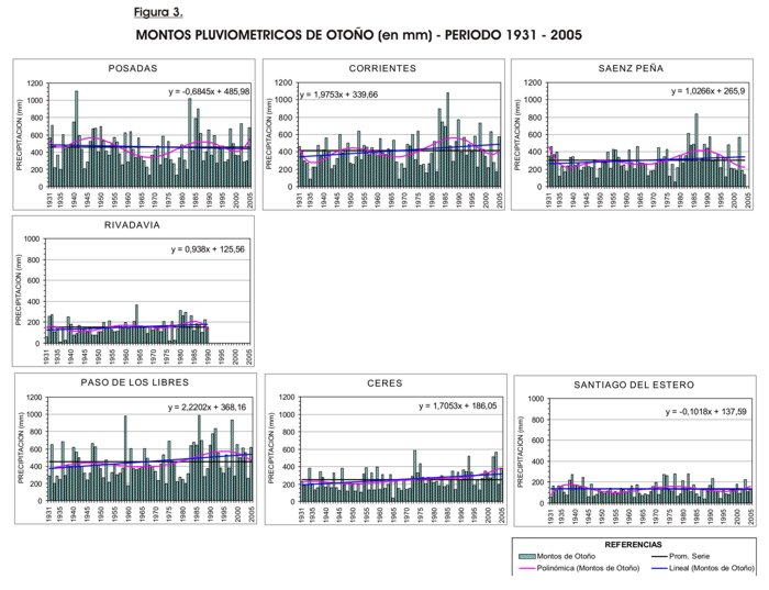 FUENTE: Datos de NOAA-GISS, Servicio Meteorológico Nacional e INTA Sáenz Peña. 4.b. Fluctuaciones de Otoño En los montos de Otoño, lo primero que se advierte es que las tendencias lineales, si bien positivas, son mucho menos marcadas que las de Verano, lo que significa que las lluvias de Otoño no tuvieron un aumento tan significativo durante el período de estudio; en segundo lugar, comienzan a aparecer tendencias lineales suavemente negativas en Posadas y Santiago del Estero.