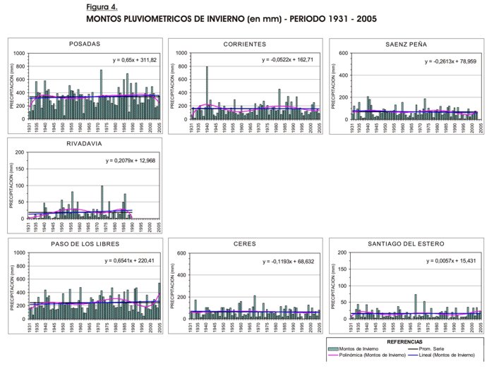 4.c. Fluctuaciones de Invierno Las tendencias lineales indican un suave incremento de las precipitaciones en Posadas, Paso de los Libres y Santiago del Estero, y una leve disminución de los mismos en el resto de las localidades. 8