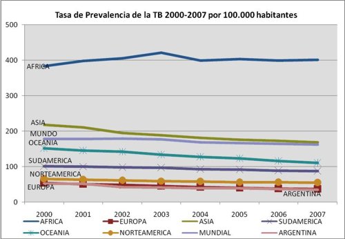 Características epidemiológicas de la enfermedadLa TB es causada por bacterias pertenecientes al complejo de Mycobacterium Tuberculosis infectando a un número estimado de 20 a 43% de la población mundial. Al año, más de 2,9 millones de personas mueren por la enfermedad en todo el mundo. Se presenta en forma desproporcionada entre personas en poblaciones con desventajas, como desnutridos, desvalidos, indigentes, marginados, y otros individuos que habitan aglomerados en hogares con condiciones deplorables. Existe una producción cada vez mayor de TB entre individuos infectados con HIV / SIDA (Síndrome de Inmunodeficiencia Adquirida). Esta enfermedad suele asentar en los pulmones, pero en el 33% de los casos afecta a otros órganos. La infección con Mycobacterium Tuberculosis se inicia cuando una persona susceptible inhala gotitas dispersas en el aire cuyos núcleos contienen organismos viables. Los bacilos de la TB que alcanzan los alvéolos son fagocitados por macrófagos alveolares, y se produce infección cuando las bacterias inoculadas escapan de la actividad microbicida de estos macrófagos. Una vez que se establece la infección, se produce en forma típica, su diseminación linfática y hematógena, antes de que se desarrolle una respuesta inmunitaria eficaz. En esta etapa de la infección, llamada TB primaria, suele ser clínica y radiográficamente silenciosa (Tierney, 2006: 249). Los individuos con esta infección de TB latente no tienen una enfermedad activa y no pueden transmitir los organismos a otras personas. Sin embargo, es posible que la infección se reactive si se produce deterioro en las defensas inmunitarias del huésped. Cerca del 10% de los individuos con TB latente que no recibe terapia preventiva, desarrollará TB activa durante el transcurso de su vida y en la mitad de los casos esto sucede dentro de los dos años siguientes a la infección primaria. Hasta un 50% de los pacientes infectados con el virus del HIV desarrollará TB activa en un plazo de dos años posterior a la infección con el bacilo de la TB. Diversos trastornos, como la gastrectomía, silicosis y diabetes mellitus y estados acompañados de depresión inmunitaria se relacionan con aumento en el riesgo de reactivación. En cerca del 5% de los casos, la respuesta inmunitaria es inadecuada y el huésped desarrolla TB primaria progresiva, acompañada por síntomas pulmonares y constitucionales. Además aumentó el porcentaje de pacientes con presentaciones atípicas, en particular ancianos, pacientes con infección por HIV y aquellos que habitan en asilos (Tierney, 2006: 250). Situación de la Tuberculosis a nivel mundial y regionalLa TB se constituye en un auténtico problema de salud pública, tanto a nivel local, nacional como mundial, por lo que es necesario analizar su situación epidemiológica actual que es muy importante para comprender correctamente esta enfermedad. Este análisis se realiza examinando los principales indicadores que son la tasa de prevalencia, incidencia y mortalidad o letalidad (1). Según los datos de la OMS, en el período 2000-2007, la prevalencia de esta enfermedad es la que se puede apreciar en el gráfico 1. Como podemos observar el promedio mundial, inferior a 200 por cien mil habitantes, con tendencia descendente, es el resultado del comportamiento de la enfermedad en todos los continentes. El continente africano presentaba una tendencia ascendente hasta el 2003, descendió a una tasa de 400 y se mantuvo en este valor hasta el 2007. En el otro extremo, la región europea presentaba tasas que, al iniciar el período analizado, alcanzaban el valor de 53 por cien mil habitantes y su marcha descendente culminó con un valor de 37 en 2007.