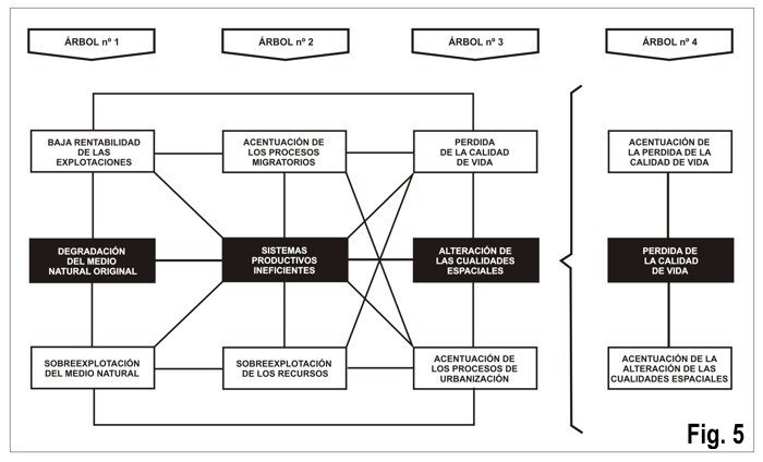 5. ANÁLISIS DE PROBLEMAS Para analizar los problemas detectados se procedió a la realización de cuatro árboles que reflejan las problemáticas más importantes de la zona (fig. 5). Cada uno compuesto de un problema central (el tronco), con sus causas (problemas iniciales o raíces) y efectos (problemas derivados o ramas). Los mismos se detallan a continuación: El problema central del Árbol de problema nº 1 es la degradación total del medio natural original en su conjunto que responde a la sobreexplotación y mal manejo que se han hecho del mismo, situación que dio lugar en la actualidad a la baja rentabilidad de la explotaciones. El Árbol de problema nº 2 hace referencia a los sistemas productivos ineficientes en cuanto a rentabilidad y sostenibilidad. El mismo responde a problemáticas ya detalladas en el árbol de problemas nº 1, vinculadas al mal manejo o sobreexplotación de los recursos naturales, por planteos poco propicios de los sistemas productivos y de comercialización. El tercer problema analizado en el Árbol de problema nº 3, es la alteración de las cualidades espaciales, debido a la acentuación de los procesos migratorios provenientes de ámbitos rurales próximos y del Gran Resistencia consecuencia de las problemáticas ya detalladas en el árbol nº 1 y 2. Esto genera un proceso de densificación urbana que deriva en una marcada pérdida en la calidad de vida de sus habitantes. El cuarto problema aparece en Árbol de problema nº 4, consiste en la pérdida de la calidad de vida de los pobladores de la zona, provocada por las alteraciones de las cualidades espaciales (tanto desde el punto de vista natural como socioeconómico); lo que deriva en la acentuación de este problema central.