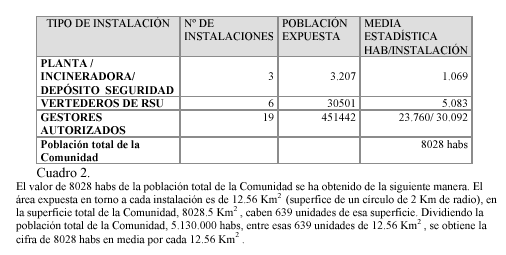 este trabajo. Otra forma de estimar la eficiencia social, a partir de los datos anteriores, puede realizarse a través de los valores absolutos de población para los sectores urbanos. Se considera como sector afectado, y por tanto se contabiliza su población, a todo aquel sector que tiene su superficie total o parcialmente bajo el área de influencia “polígono contenido”(Chakraborty et al. 1997), se excluyen aquellos que interseccionan de forma tangencial con el área de exposición. El total de la población así calculada es de 480.500 personas, en el cuadro 2 se detallan algunos datos por tipos de instalaciones. |