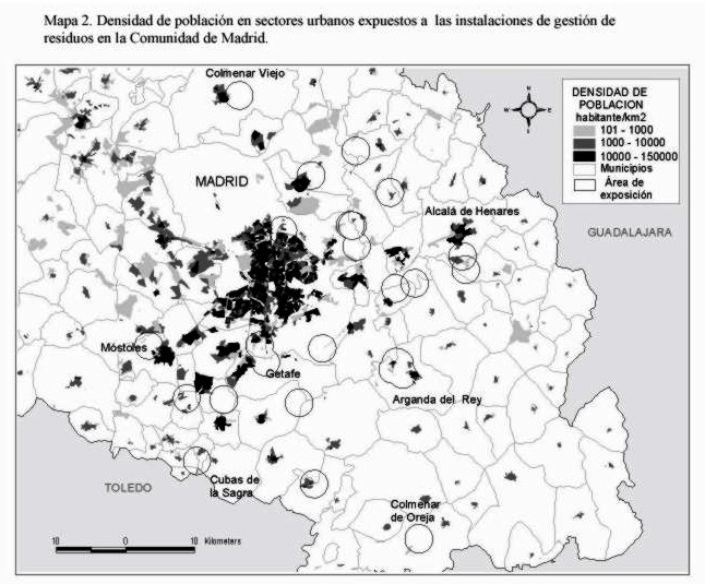 humanizados como es el caso de la Comunidad de Madrid. Una primera aproximación a la eficiencia social se puede realizar mediante la representación de la densidad de población. Para ello se cuenta con los datos del Padrón de la Población de 1996 para las entidades espaciales definidas como sectores urbanos. El sector urbano es, para nuestra escala de trabajo, la unidad estadística que mejor describe la distribución de la población en el territorio. Sin embargo, presenta un problema en los sectores que no tienen una ocupación puramente urbana, los llamados sectores diseminados, generalmente son de mayor extensión y en ellos es difícil situar la poca población que contienen, por ello se han desestimado para este estudio aquellos sectores con densidad menor a 100 habitantes/km 2 . En el mapa resultante, mapa nº 2, puede observarse cómo coinciden varias áreas de exposición con algunas zonas muy urbanizadas. Son las instalaciones de los gestores autorizados, como se viene apuntando, las que afectan a un número mayor de población debido a su situación próxima a sectores urbanos con altas densidades, en estos casos una pequeña ampliación de su radio de influencia supondría un gran incremento en la población expuesta. |