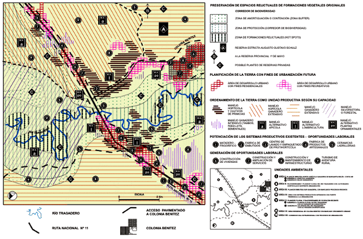 párrafos anteriores: 1. El ordenamiento de la tierra como unidad de producción en relación de su capacidad productiva. 2. La preservación de espacios relictuales de formaciones vegetales originales. 3. La preservación del patrimonio histórico arquitectónico de la zona. 4. La confección de proyectos productivos alternativos, novedosos y sustentables. 5. La potenciación de los sistemas productivos existentes. 6. La planificación de la tierra, con fines residenciales o de inversión, acorde al contexto rural. 7. La generación de oportunidades laborales para la población local. 8. La disminución de la alteración de las cualidades espaciales que permita mejorar y mantener la calidad de vida, de sus pobladores, en la totalidad del área de estudio. |
