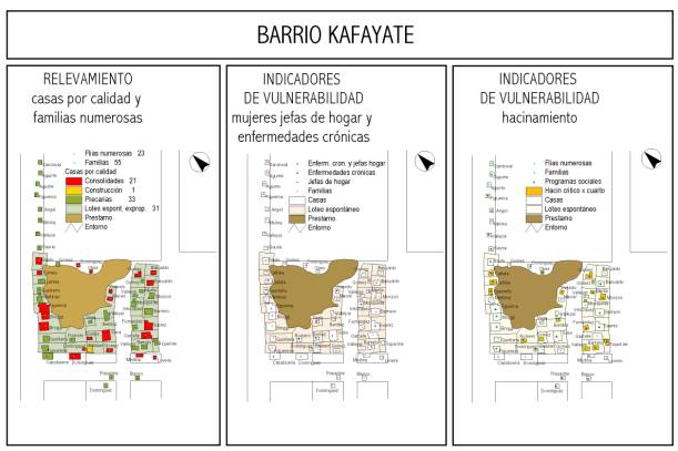Con esta información cargada, se obtienen planos a partir de consultas orientadas por el interés de determinar un perfil de la población afectada, a través de indicadores de vulnerabilidad social, como la presencia de enfermos crónicos o con capacidades diferentes, mujeres jefas de hogar, entre otros. Además, con vistas a la implementación de programas de mejoramiento del hábitat, por autoconstrucción u otras alternativas, se detectan beneficiarios de planes sociales, con conocimientos de albañilería, etc. A continuación se presentan algunas vistas de consultas realizadas.