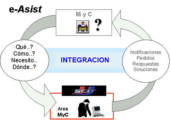 El módulo de Asistencia (e-Asist) permitirá la comunicación entre los MyC y el SCIT. Los MyC podrán enviar y recibir mensajes a través del sistema y el SCIT podrá monitorear y resolver los problemas en forma remota.