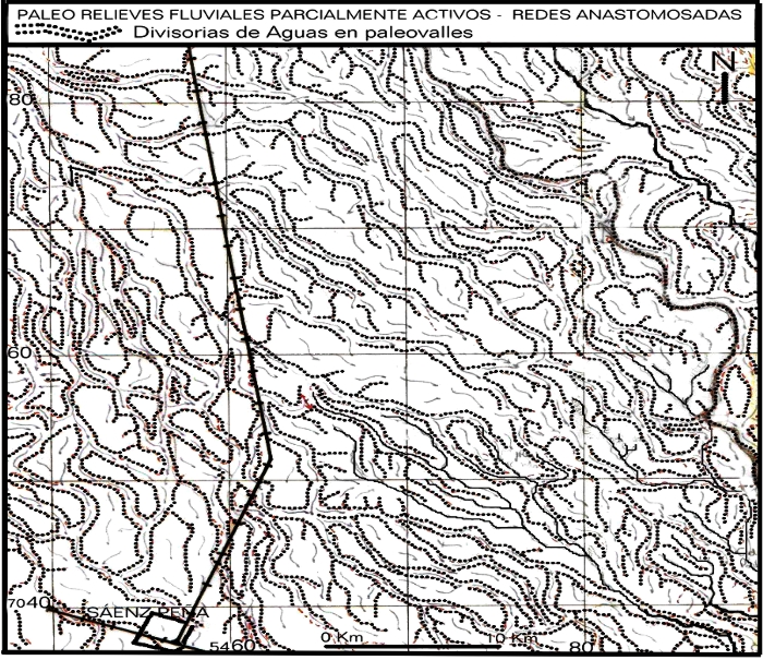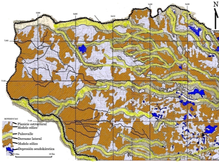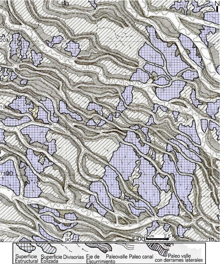 Para la confección de las cartas definitivas se utilizó en parte la simbología convencional ya utilizada para los trabajos de fotointerpretación del Centro de Geociencias, pero a los fines de la información escrita, fue necesaria la elaboración de un código que identifique: 1- Los Sistemas de Escurrimiento (POPOLIZIO, E. 1975 a): 1- Los grandes tipos de sistemas de escurrimiento: Escurrimiento Laminar (EL), Escurrimiento Fluvial (EF), Escurrimiento Subterráneo (ES), Escurrimiento Transicional (ET); 2- Subtipos del escurrimiento laminar: Laminar mantiforme (ELm), Laminar Difuso (ELd), Laminar Filetiforme (ELf), Laminar cañadoide (ELc), Laminar Esteroide (ELe), Laminar backswámpico (ELb); 3- Subtipos del escurrimiento transicional: Transicional cañadoico (ETc), Transicional esteroico (ETe), Transicional surcoico (ETs), Transicional carcávico (ETc), Transicional torréntico (ETt); Transicional uádico (ETu); 4- Subtipos del escurrimiento fluvial: Fluvial potamoico (EFp), Fluvial deltoide (EFd), Fluvial conoidal (EFc), Fluvial Riarrioideo (EFr); 5- Subtipos del escurrimiento subterráneo: Subterráneo mantiforme ( ESm), Subterráneo filetiforme (ESf), Subterráneo Difusoide (ESd), Subterráneo Kárstico (ESk), Subterráneo seudokárstico (ESs), Subterráneo potamoide (ESp). 2- Las Redes de Escurrimiento ((POPOLIZIO, E. 1975 b): 1-Tipos elementales de redes: dendrítica, pinada, paralela, ortogonal, angular, emparrada, bayoneta, radial, anular, parabólica, collar de cuentas, laberíntica, cribada, flabeliforme; 2- Redes compuestas; 3- Paleo redes; 4- Redes fantasmas. La simbología geomorfológica- hidrográfica destaca aspectos: 1- Morfológicos: diferentes quiebres de pendiente que pueden ser asociados con las características litológicas y establecer límites para unidades geomorfológicas: 1- los quiebres de ladera convexas, 2- los quiebres bruscos de pendiente bien notorios y 2- los quiebres bruscos de pendiente, probables. 2- Morfogenéticos: Destacan este rasgo en las unidades de relieve por lo menos para establecer las diferencias más evidentes, más allá de entender que esto requiere un ajuste mayor en cuanto a técnicas de determinación. Los 4 principales tipos de morfologías encontradas son: 1- de origen eólico; 2- paleo fluvial; 3- seudokársticas y 4- planicies de génesis imprecisa (pedimentos?)