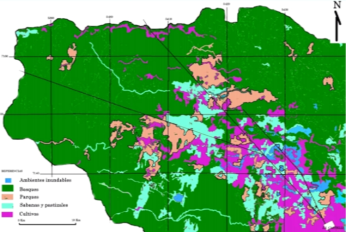 4- Hidrobiológicos: Representan lo que en las fotos traduce el patrón de la vegetación acuática en ambientes deprimidos de esteros y las unidades de vegetación herbácea, asociada a un patrón tono textural de ambientes periódicamente anegables como los bañados, cañadas o malezales. 5- Fitogeográficos: En las cartas fitogeográficas se utilizó el criterio del tipo biológico dominante (árbol, arbusto o hierba) y la altura de los pisos verticales discernibles. Fue posible identificar unidades de: 1- bosques (B), en sub variedades abiertos y cerrados, altos, bajos y con abras; 2- parques (P) arbóreos, arbustivos y mixtos y 3- sabanas (Sa), arbóreas, arbustivas y mixtas, con relativa seguridad, mientras que entre los ambientes de 4- pastizal (P), 5- pajonal (Pj) y 6- de prados acuáticos (Pr), la complejidad fue mayor debido a la transicionalidad de los gradientes topográficos que condicionan los hídricos y en consecuencia, la seriación vegetal hace difícil trazar los límites entre fisonomías. Las figuras que se adjuntan pueden dar una idea de las características de los trabajos realizados, su nivel de detalle para distintos sectores. Los originales de las mismas están en blanco y negro, pero a los fines de su presentación y mejor interpretación de los detalles, algunas han sido coloreadas. Con miras a la publicación del material cartográfico, se realizó una síntesis a escala 1:250.000 donde son representadas las principales cuencas, por sectores, con caracterización de las divisorias y las diferentes unidades geomorfológicas a esa escala. Ese es el material cartográfico que acompaña a los trabajos citados en POPOLIZIO, E., SERRA, P. y HORTT, G. (1.978 a y b).