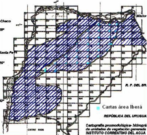 FIGURA 8: Malla de cartas geomorfológicas e hidrográficas que cubren la provincia de Corrientes con indicación del área cubierta con fotointerpretación donde se destaca el área del Iberá. Comparar con la FIGURA 1. Materiales y métodos: Se trabajó durante los años 1979 y 1993 sobre la base de fotos aéreas realizadas por el Instituto Foto Topográfico Argentino, IFTA, Trabajos: 223, 223 A, (de escala media 1:30.000- Año 1959) y 125 (de escala media 1:25.000- año 1968) y 138, en un total aproximado de 1500 fotogramas. Como referencia planimétrica de las cartas a realizar se tomaron las cartas IGM de escala 1:250.000; a partir de ellas se fijó una malla de coordenadas marginales y centrales, asignando a cada carta 3 cuadrículas Gauss Kruger en longitud y 2 en latitud, por lo que cada carta cubre 600 Km2. El número total de cartas que cubre la provincia es de 198 habiéndose realizado en el período en estudio, un total de 113. Se ajustó luego la planimetría por medio del paso a escala de la infraestructura (rutas, puentes, vías férreas, sendas, poblaciones, puestos, etc.) y otras referencias naturales (ríos, lagunas etc.) que permitieron situar espacialmente los objetos del terreno representados en las cartas y visibles en las fotos. Fue esa una manera de lograr que los over lays entre sí, ajustaran sus relaciones de distancia y forma, del modo más preciso posible. A pesar de ello debieron compensarse y corregirse las distorsiones propias de la proyección de las fotos y las producidas en el avión, durante el vuelo. Para evitar el arrastre de errores, cada carta fue ajustada con sus periféricas, realizando de esta manera la integración de todos los elementos representados por la simbología. Utilizando estereoscopio de bolsillo, se realizó la fotointerpretación par por par interpretando los elementos geomorfológicos que a la escala de la foto se comportaran como condicionantes del escurrimiento, las unidades geomorfológicas, los patrones hidrográficos y las unidades fisonómicas de vegetación asociadas (estas últimas en over lays separados). Cada over lay fue pasado a cartas preliminares de papel y definitivas de papel y film de escala media 1:33.000 donde además se indicaron las principales rutas, centros poblacionales según el damero de la foto y la toponimia hidrográfica.