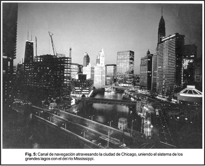 De esta manera esta última era el lugar estratégico para la fabricación de acero y se desarrolló allí la mas grande acería de Estados Unidos, la Steel Company. Pero, la ciudad estaba emplazada en el extremo norte de la gran zona maicera y ganadera del país, de manera que la producción de maquinaria agrícola fue una de las actividades básicas de la ciudad. Además, los Grandes Lagos originan una zona microclimática a su alrededor, menos rigurosa y permite la formación de una faja de producción de frutales y el desarrollo del ganado lechero. De manera que las condiciones naturales son una de las causas condicionantes del desarrollo en el Medio Oeste de la gran metrópoli de Chicago, a lo cual se sumaron otros resultantes de la combinación de estas con las obras humanas. La proximidad del Lago Míchigan al sistema del río Mississippi permitió que se construyera un canal entre ambos que atraviesa la ciudad y permitió el transporte fluvial hacia el sur en dirección a Nueva Orleáns (Fig. 5).