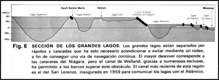 La navegación hacia el este estaba dificultada por las cataratas del Niágara, pero en el siglo pasado una obra enorme de ingeniería logró vencerlas mediante un canal lateral que permite el paso de buques de ultramar, originando lo que se llamó El Octavo Mar (Fig. 6).